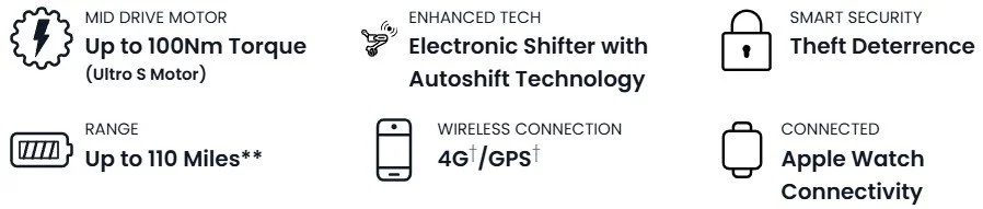 Smart Features: Uphill Start Assist, E-Shift, Autoshift, Ride Tune, 4G/GPS, Unusual activity detection, E-lock, Hold Mode, Remote Notification